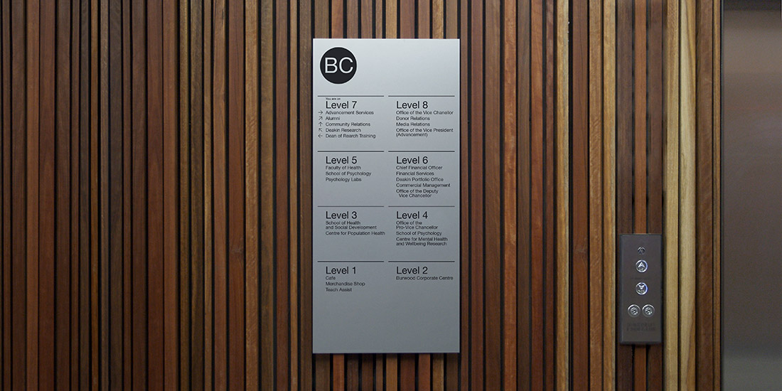 Working alongside Woods Bagot, and in step with Deakin University’s signage guidelines, we applied a simple wayfinding process to this new building, addressing pedestrian and vehicle travel. The project also covered building directory, and regulatory and statutory signage.
