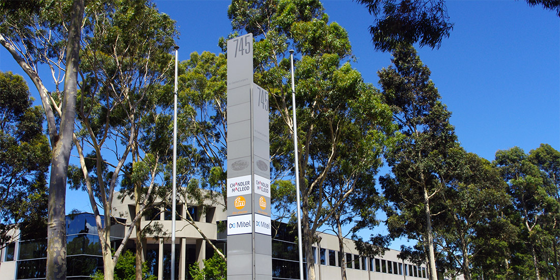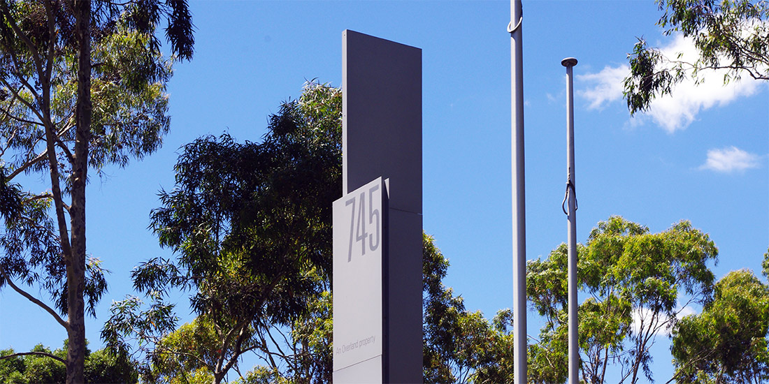 An eyecatching business park tenant sign, providing logo display for tenants in a tasteful and consistent way. The āvā shape was designed to provide maximum visibility to a very busy intersection, within the constraints of a medium scale sign.