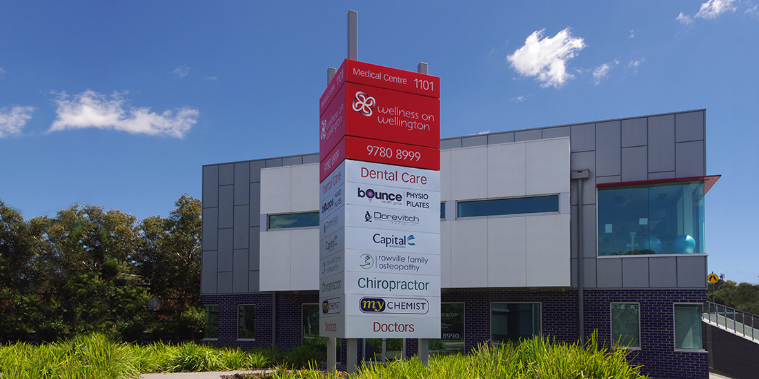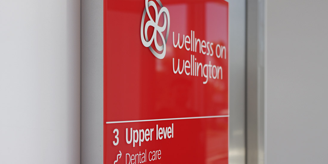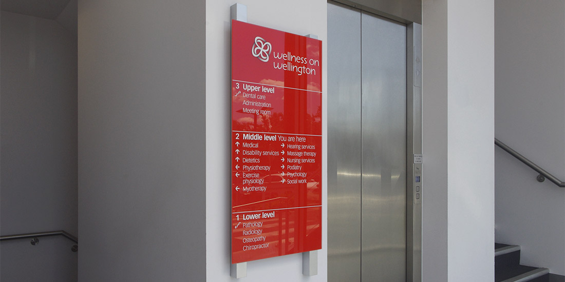 The community health centre, Wellness of Wellington, is signed by freeway brand signage, entry identification lettering, building and level directories, simple wayfinding signs, as well as required feature and door label, fire and statutory signage. Our design works in hand with the centre logo and other visual brand concepts.